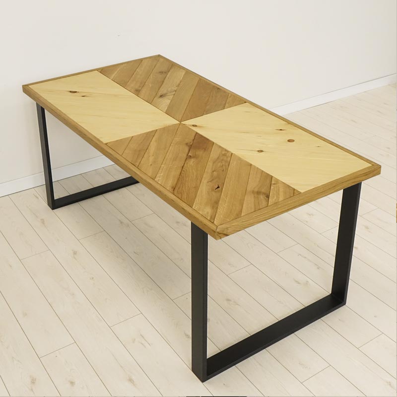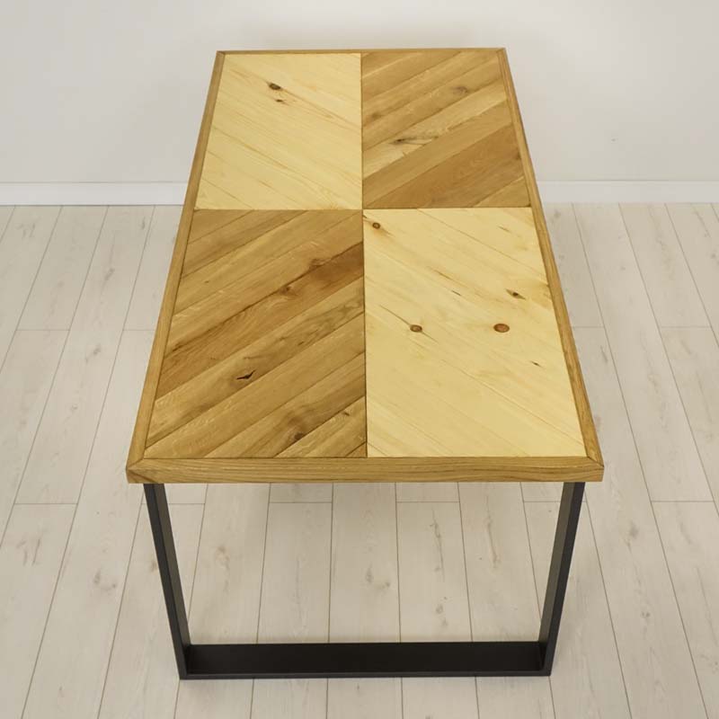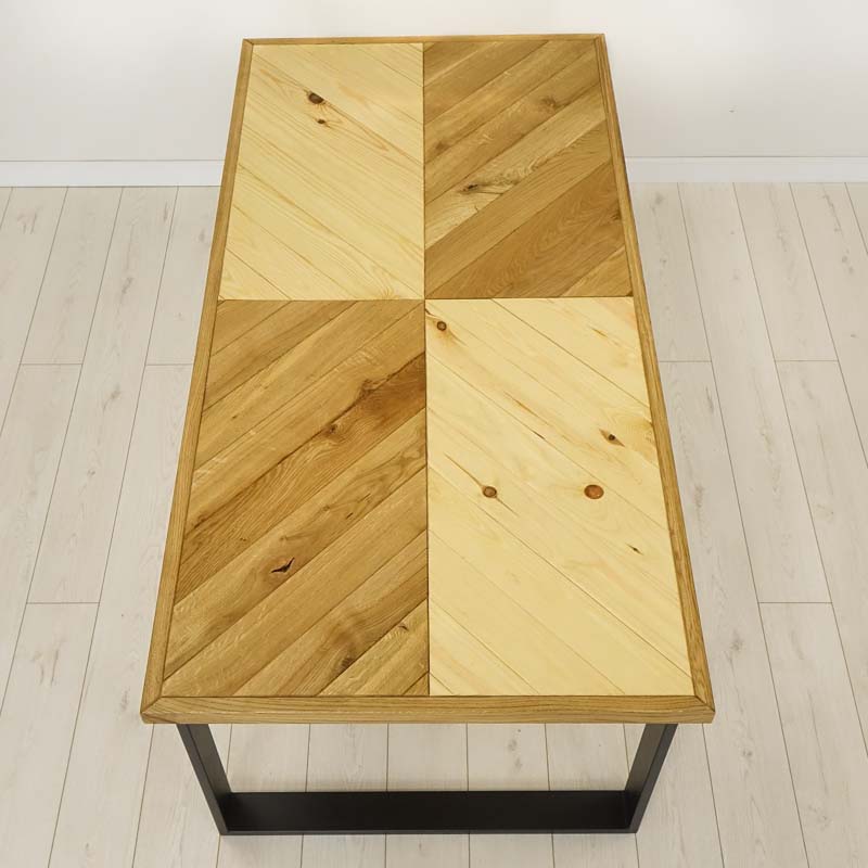 Niesztampowy, drewniany blat wykonany z połączenia dwóch rodzajów drewna. Całość zyskuje ciekawą, mieszaną kolorystykę w kształcie szachownicy, wynikającą z naturalnych różnic między dębem a sosną. Produkt wybarwiony został techniką olejowania na kolor naturalny, dzięki temu zachował wyczuwalną fakturę oraz odcień zbliżony do surowego drewna.