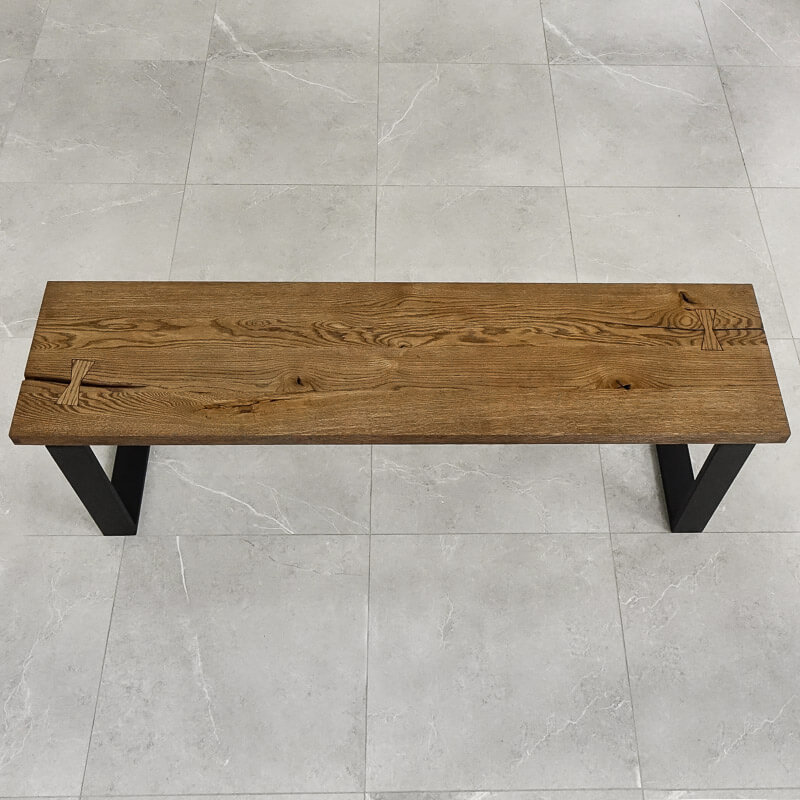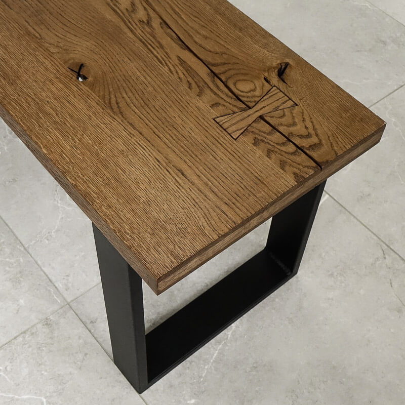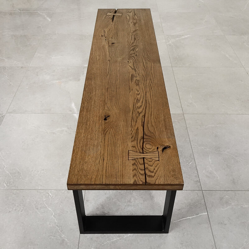 Typowo rustykalny i charakterny blat drewniany do ławek zabezpieczony brązowym olejem jest odważną propozycją dla wszystkich ceniących sobie wyjątkowe i niepowtarzalne meble. Głębokie rozpękania - również na pełną grubość materiału - i łączenia na jaskółcze ogony są łagodzone klasycznym kształtem blatu. Ławka stworzona z połączenia dębowego blatu ze stalowymi nogami jest nie tylko praktycznym meblem, ale też ważnym elementem aranżacji wnętrza. Designerskie siedzisko doskonale uzupełni rustykalne jadalnie i kuchnie, ociepli loftowe przedsionki i przełamie styl nowoczesnych przestrzeni.