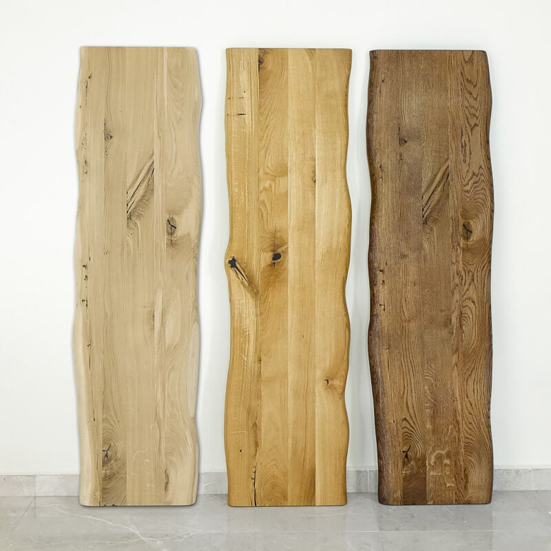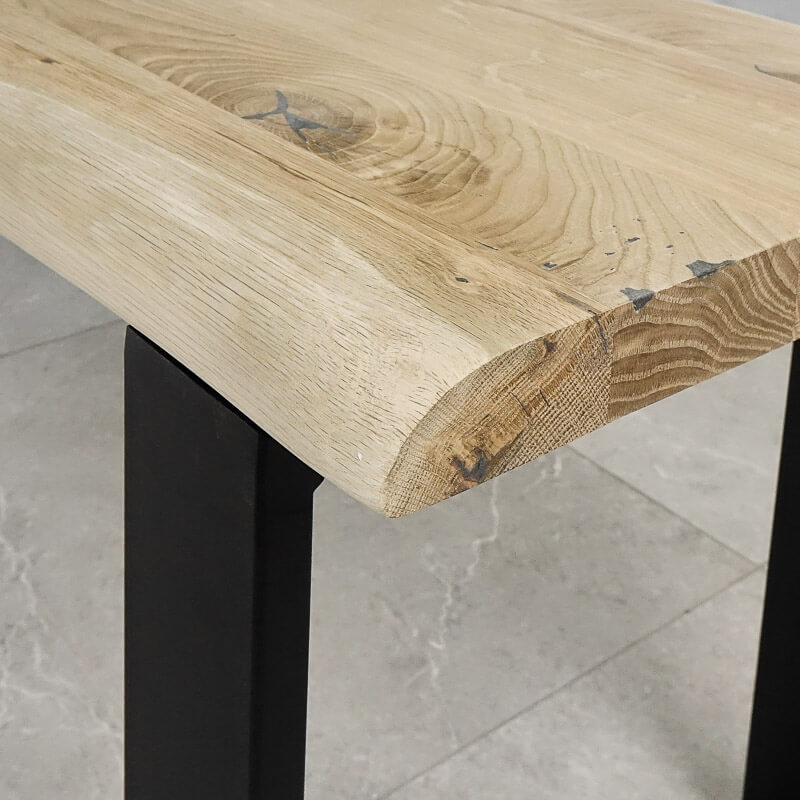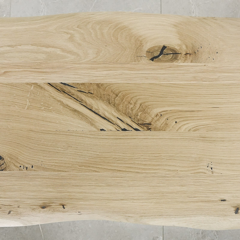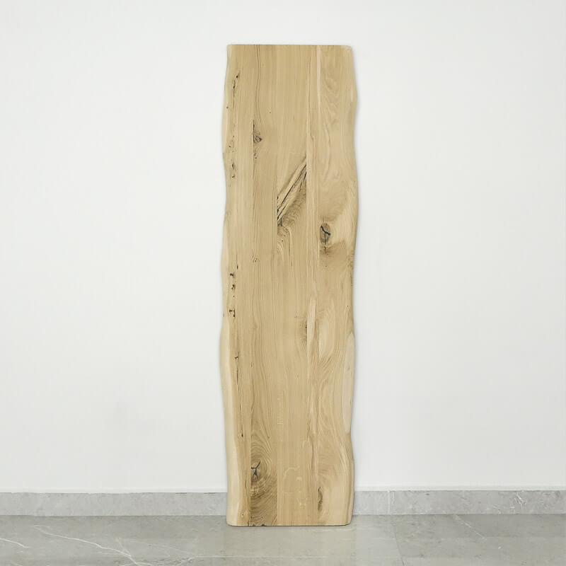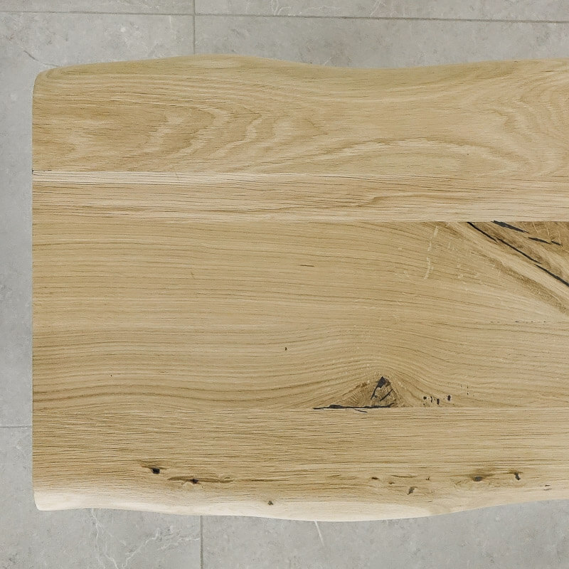 wąski blat dębowy o dwóch nieregularnych krawędziach (oflis wzdłuż usłojenia)
