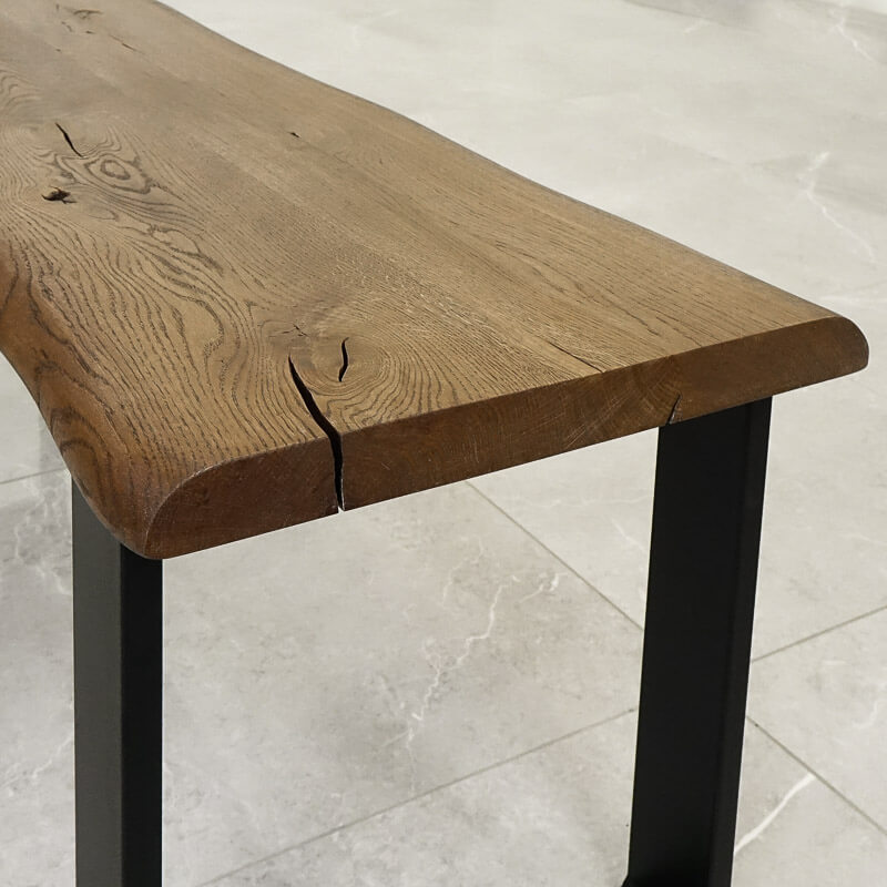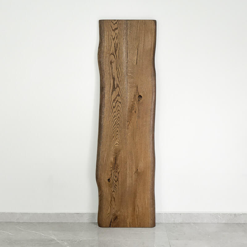 wąski blat dębowy o dwóch nieregularnych krawędziach (oflis wzdłuż usłojenia)