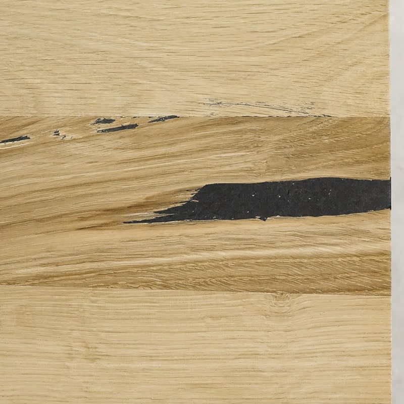 szczeliny i rozpękania wypełnione masą do drewna dębowego po stronie wierzchniej (bez wypełnienia od spodu)