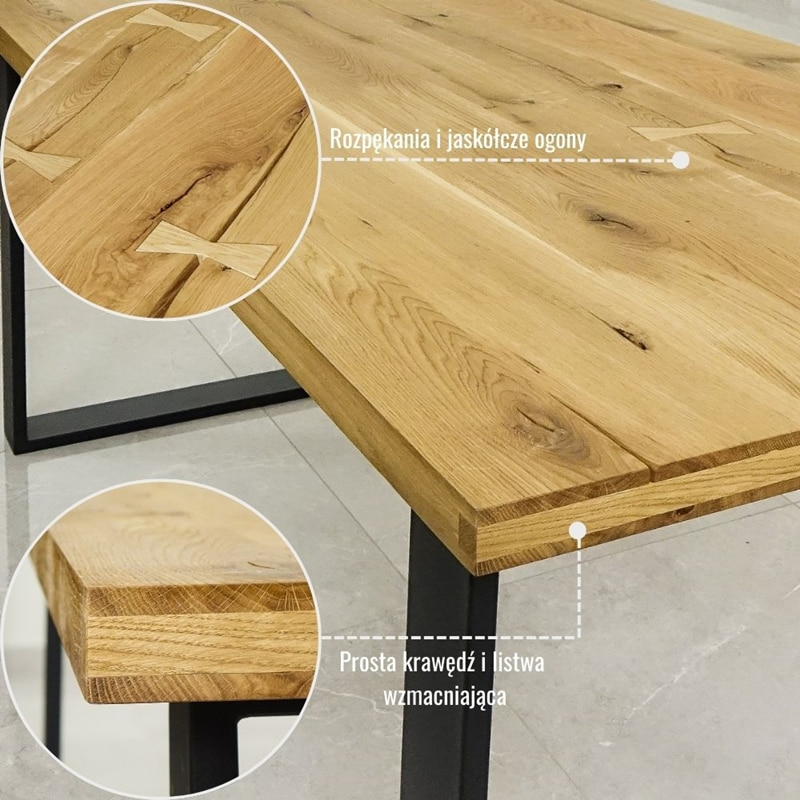 Blat na stół utrzymany w typowo rustykalnym klimacie to wyjątkowe dzieło sztuki, które - w połączeniu z nogami meblowymi - zdobi każdą jadalnię, kuchnię, czy salę konferencyjną. Solidny dębowy blat, wzmocniony dodatkowo listwami, stanowi stabilną podstawę do stworzenia wymarzonego stołu, stolika i biurka. Możliwość wystąpienia głębokich rozpękań i łączeń na jaskółcze ogony - umiejscowienie uzależnione od doboru surowca - świadczy o unikalności każdego egzemplarza. Olejowanie zapewnia dębinie powłokę ochronną, nie tworząc jednocześnie błyszczącej powierzchni. Naturalny kolor pięknie podkreśla usłojenie blatu. Wyjątkowy dębowy blat do stolika jest praktycznym elementem wyposażenia oraz designerskim dodatkiem. Bogata oferta blatów i nóg meblowych oferowana w naszym sklepie umożliwia skonfigurowanie wymarzonego stołu do jadalni, stolika kawowego czy biurka. Jedyne co nas ogranicza to nasza wyobraźnia.