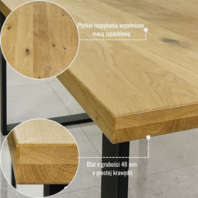 Dlaczego SOLID? Jest to solidny dębowy blat do stołu wyróżniający się w ofercie sklepu swoją grubością. Klejony blat do stołu o spokojnym charakterze, z wypełnionymi szpachlą płytkimi szczelinami. Model idealny do stworzenia designerskiego stołu jadalnianego. O elegancji blatu świadczą choćby zaoblone krawędzie. Perfekcja wykonania możliwa jest między innymi poprzez technologię wykorzystaną w produkcji - oferowany blat na stół to model obłogowany, co pozwala na selektywny dobór materiału wedle usłojenia. Blat o czterech prostych brzegach to klasyka, która sprawdza się w różnych stylach - od retro i vintage, przez rustykalny, po loft i industrial. Klejenie z węższych desek (16 lub 18cm, w zależności od szerokości blatu) również wpływa na wyjątkowość oferowanego blatu. Blat drewniany impregnowany olejem naturalnym zyskuje ciepły, słomkowy odcień. Taka forma zabezpieczenia drewna dębowego podkreśla unikalne usłojenie, nie pozostawiając przy tym żadnej widocznej lub wyczuwalnej powłoki.