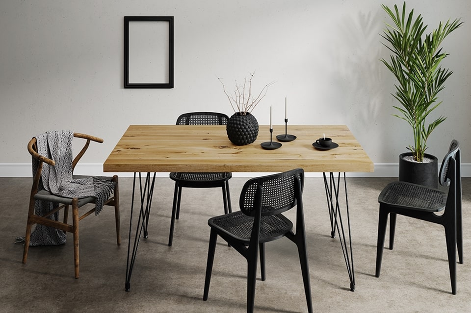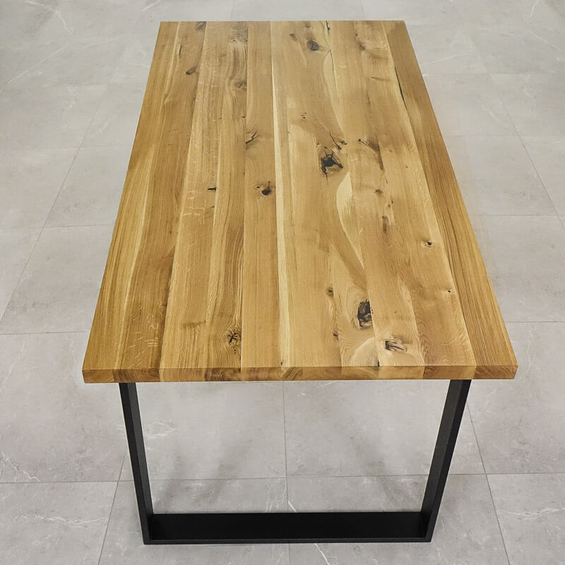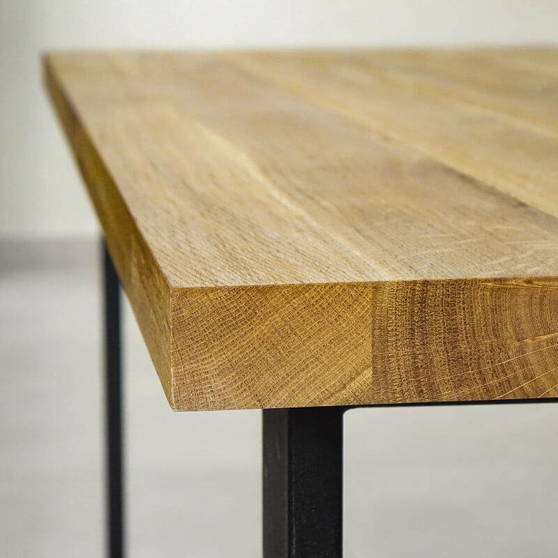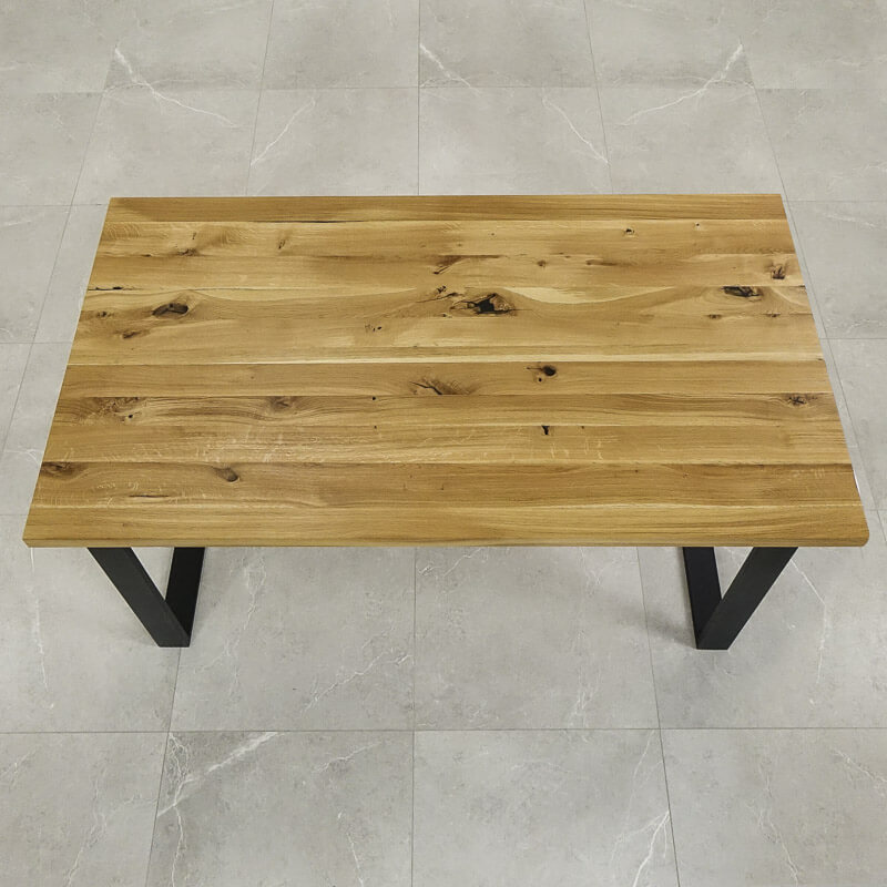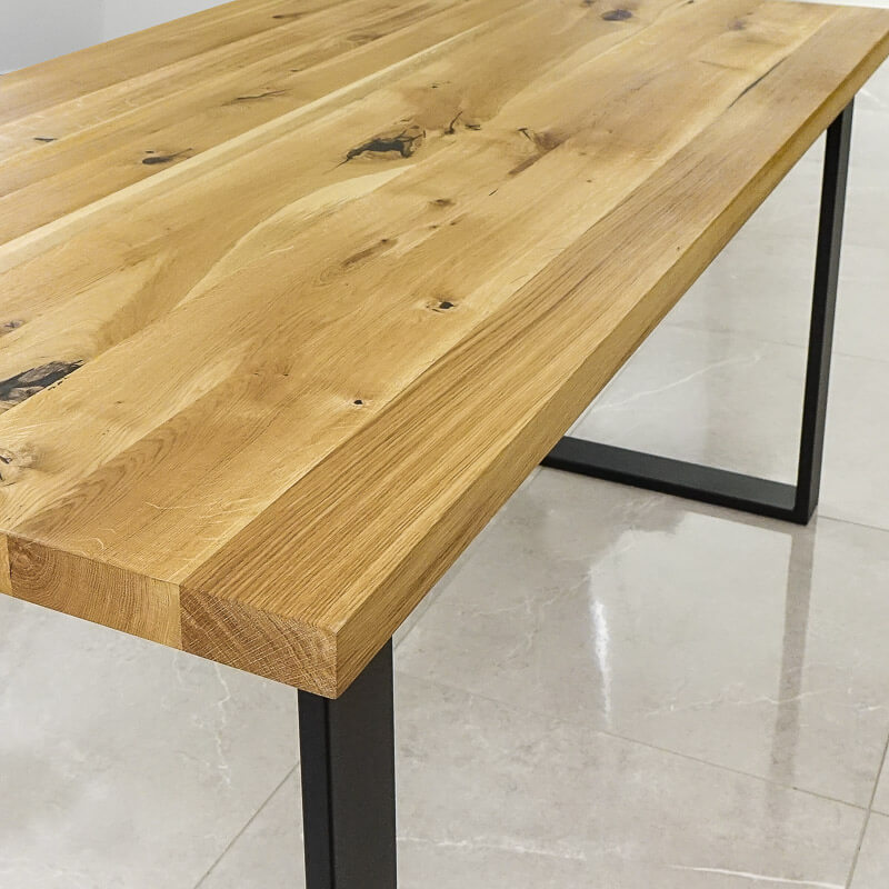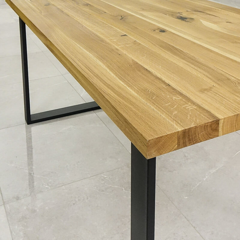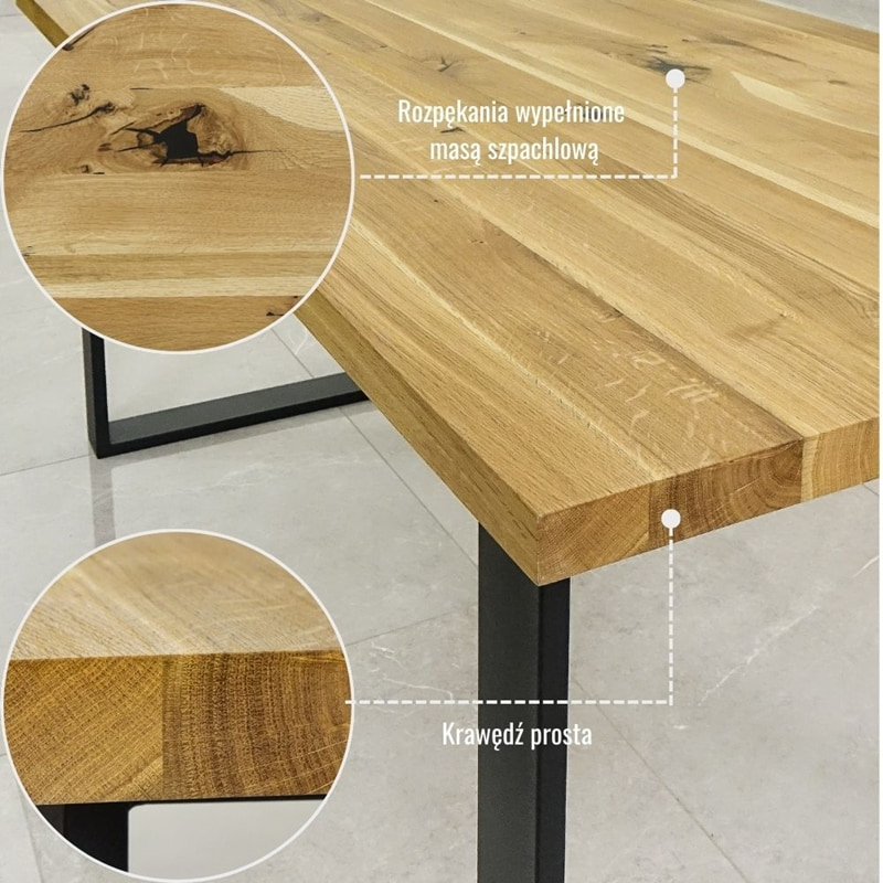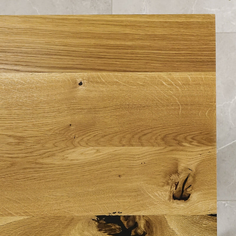 Blat dębowy z uzupełnionymi czarną masą ubytkami i krawędziami dociętymi do kąta to bezpieczna, ale i stylowa propozycja. Tak wdzięczny materiał, jakim jest dębina, wpisuje się w charakter wielu stylów wnętrzarskich - loft, industrial, rustyk. Zyskujące popularność połączenie drewna i stali świetnie zaprezentuje się w formie stolika, stołu do jadalni, biurka, czy półki.
