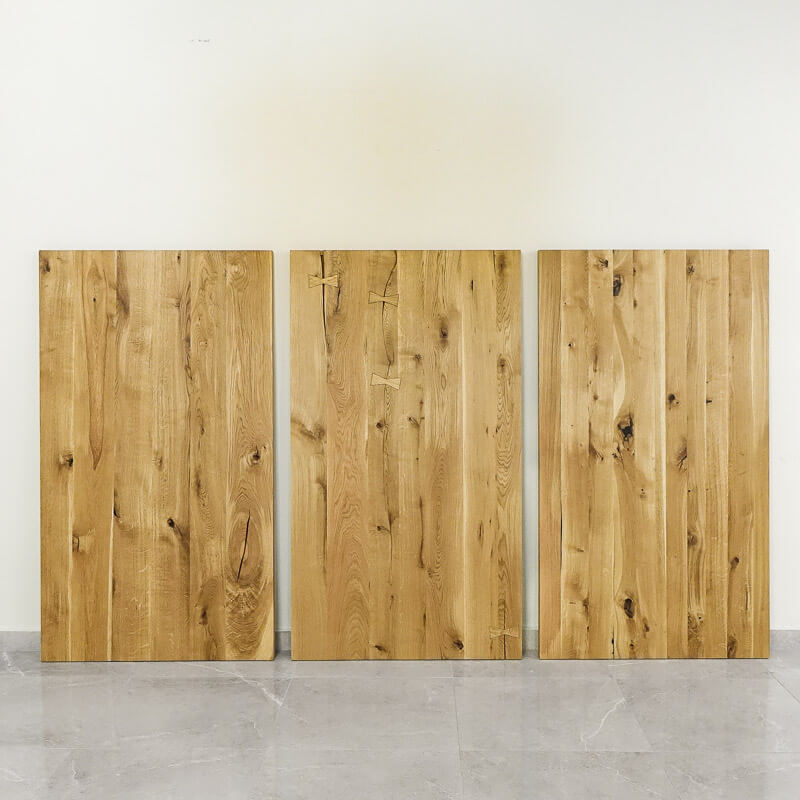 szczeliny i rozpękania wypełnione masą do drewna dębowego po stronie wierzchniej (bez wypełnienia od spodu)