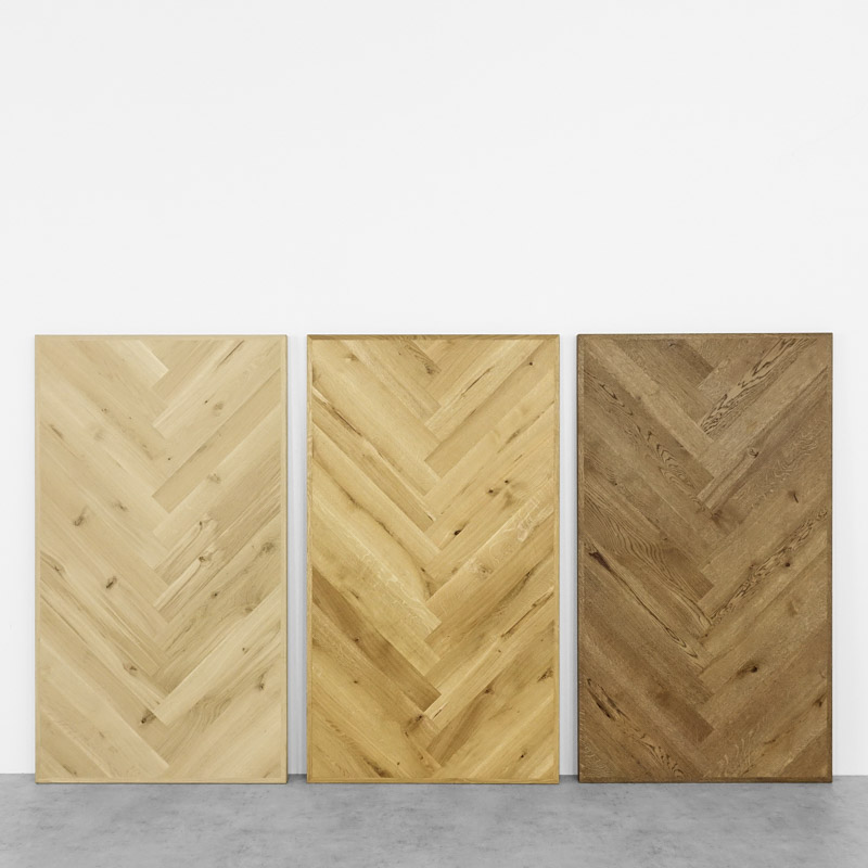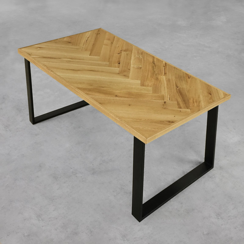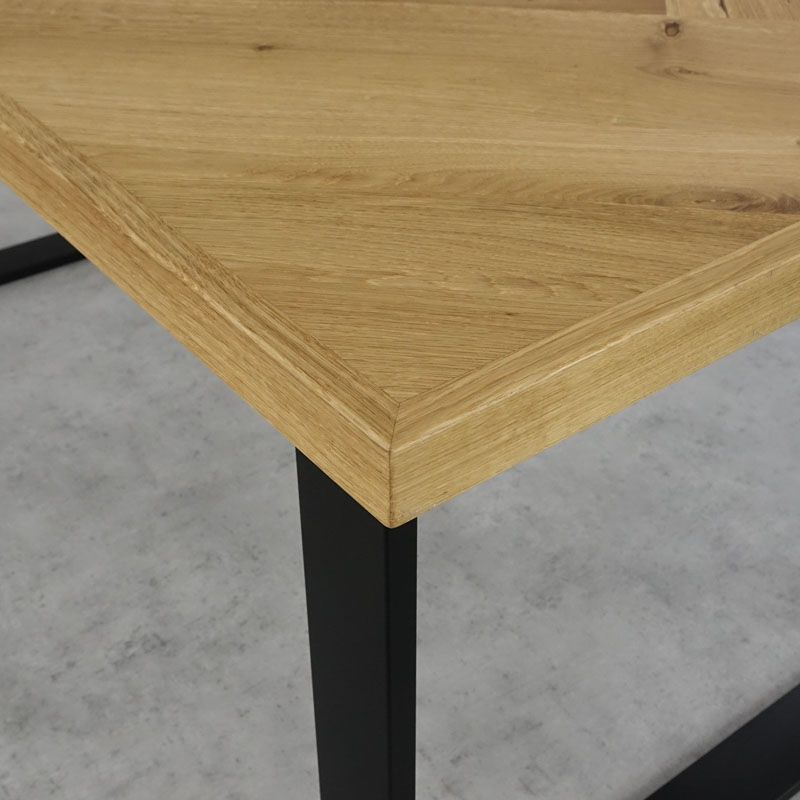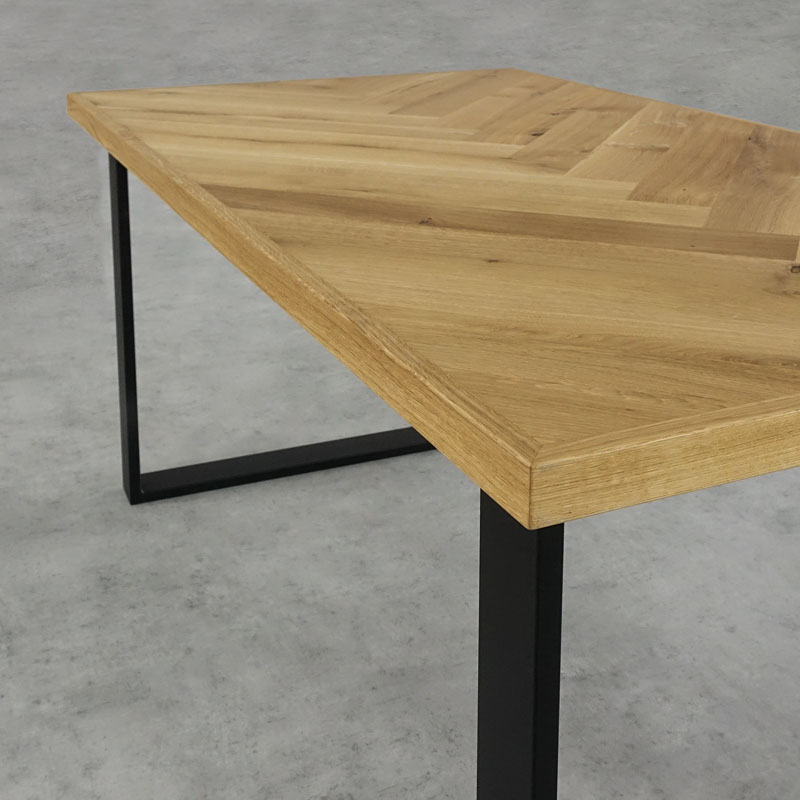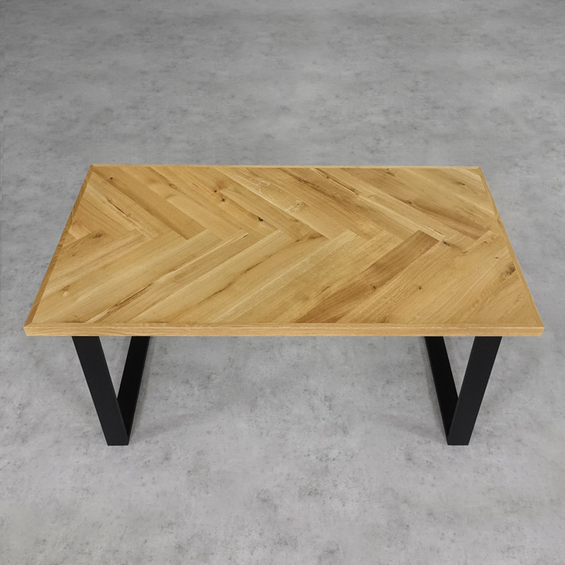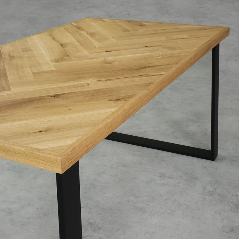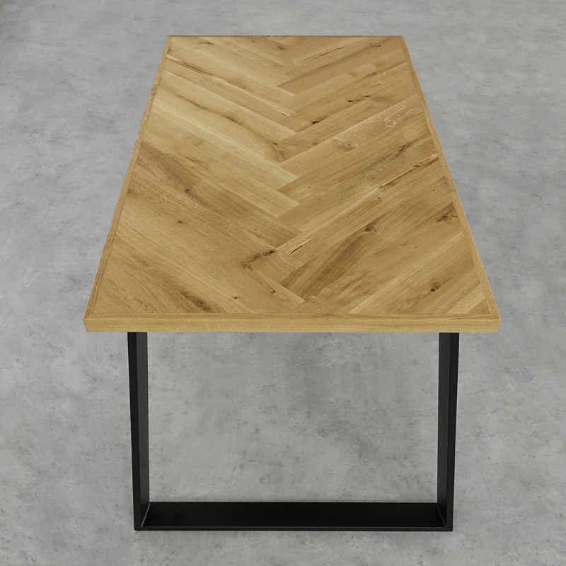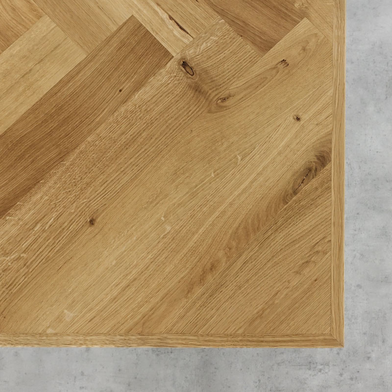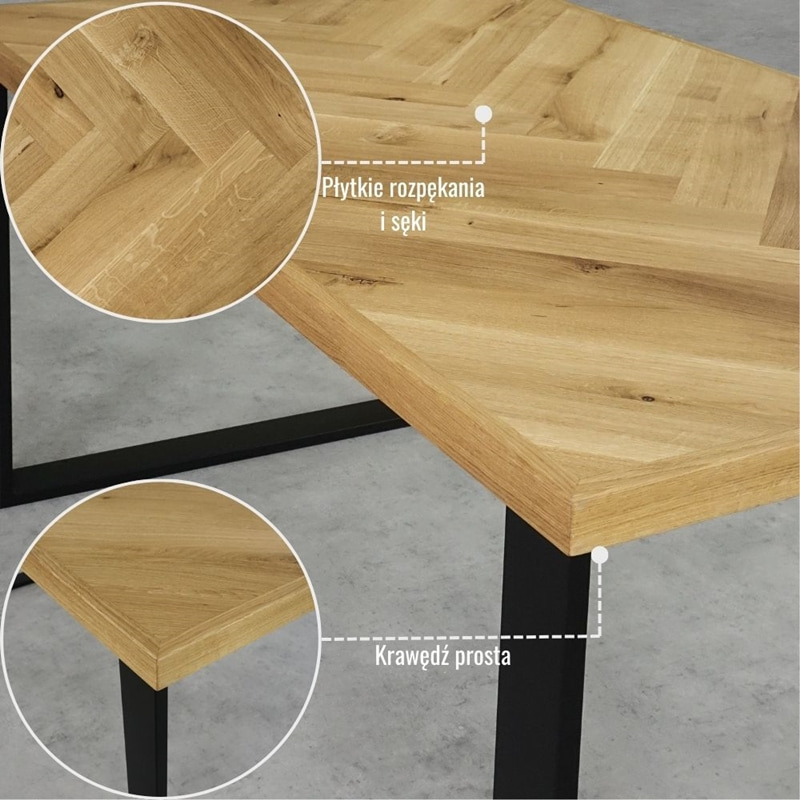 Blat klejony jest warstwowo, dodatkowo posiada ramę z drewna dębowego, co zapewnia trwałość i odporność na odkształcenia. Obłóg o grubości 3 mm eksponuje niepowtarzalne cechy drewna, takie jak sęki i pęknięcia. Tak skonstruowany blat o grubości 4 cm, będzie nam służył przez długi czas, a zastosowany wzór w klasyczną jodełkę francuską będzie zdobił nasze wnętrze.