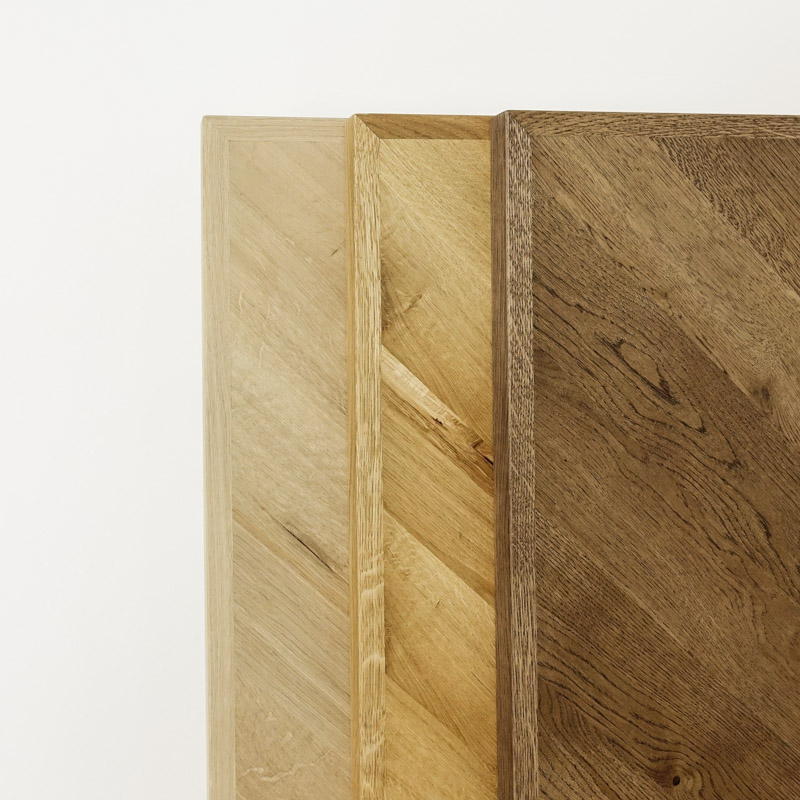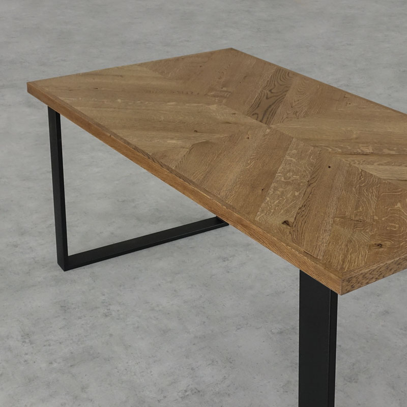 Stół jest sercem domu, dlatego jego wybór jest kluczowy. Dzięki osobnej ofercie blatu oraz nóg możesz spersonalizować go pod swoje potrzeby, oraz gusta. Połączenie drewnianego blatu wraz z metalowymi nogami stworzy kompozycję idealną do wnętrz industrialnych, loftowych. Natomiast połączenie blatu wraz z nogami drewnianymi sprawi, że odnajdzie się on również we wnętrzach klasycznych czy skandynawskich. Wybierając blat o rozmiarach 80 × 80 mamy możliwość stworzenie oryginalnego stolika barowego lub też piękny stół na nasz balkon czy taras. Prezentowany blat posiada mocną dębową ramę, która zapewnia stabilność, a zastosowanie obłogu o grubości 3 mm eksponuje niepowtarzalne cechy drewna, takie jak sęki i pęknięcia. Blat jest odporny na odkształcenia, co gwarantuje jego trwałość na wiele lat. Blat został zabezpieczony olejem w kolorze brązowym, który idealnie współgra ze wzorem w jodełkę, podkreślając elegancję produktu. Oferujemy blaty w różnych rozmiarach, co pozwala na stworzenie zarówno stołu, stolika kawowego, barowego, jak i biurka.