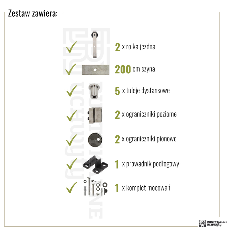 - Produkt dedykowany jest do drzwi przesuwnych, których masa całkowita nie przekracza 110 kg, ostatecznie jednak waga drzwi musi być dostosowana do rodzaju ściany i jej wytrzymałości.