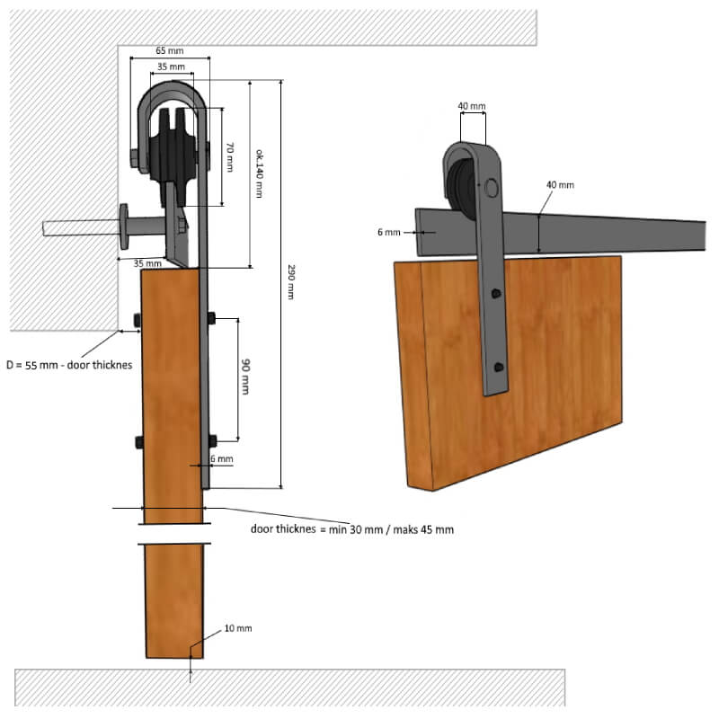 - Należy uwzględnić, że ściana, do której system ma zostać zamontowany, musi umożliwiać wykonanie nawiertów na głębokość minimum 5 cm oraz utrzymanie ciężaru zarówno systemu przesuwnego, jak i drzwi, które zostaną do niego zamontowane. Montaż produktu w niepełnej ścianie, np. kartonowo-gipsowej, możliwy jest tylko i wyłącznie po zastosowaniu adekwatnych wzmocnień konstrukcyjnych i doborze odpowiednich kołków i akcesoriów.