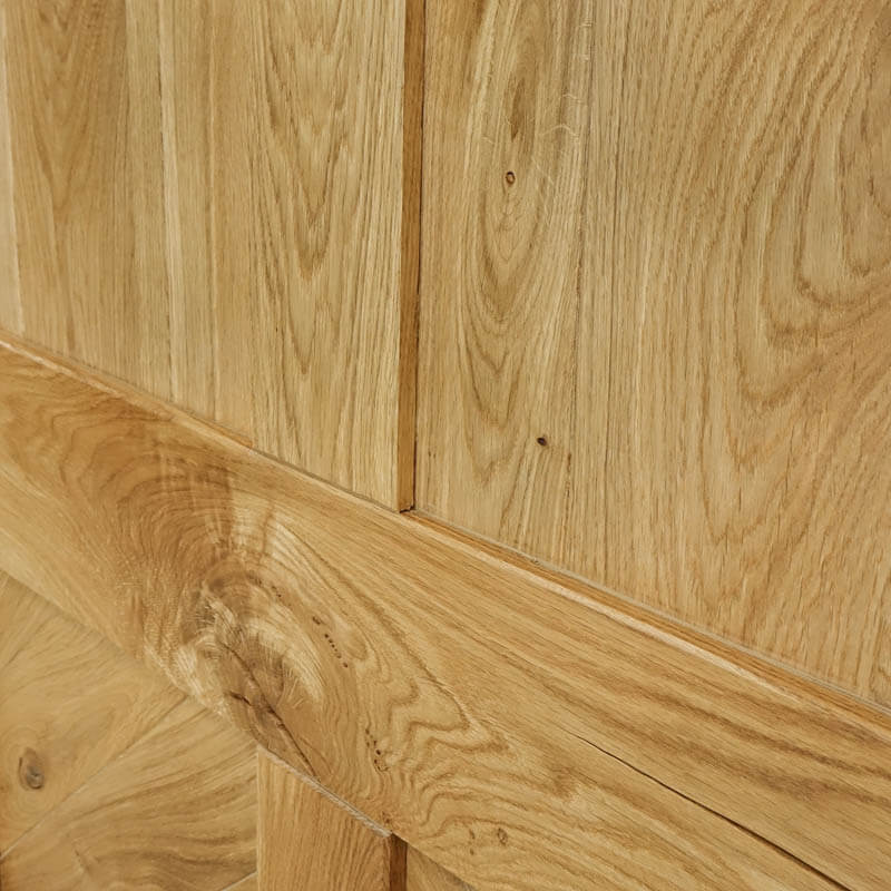 Drzwi przesuwne dębowe Szewron to propozycja dla osób ceniących naturalne piękno drewna i subtelny charakter rustykalny. Solidna rama z litego drewna zapewnia stabilność oraz trwałość skrzydła, a jednocześnie pełni funkcję dekoracyjną, podkreślając unikatowy design drzwi.