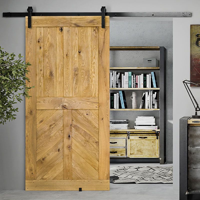 Na powierzchni zastosowano klasyczny wzór jodełki, który w modelu Szewron został zestawiony z prostymi deskami w drugiej części skrzydła. Dzięki temu drzwi zyskały wyjątkową równowagę pomiędzy elegancją a rustykalnym stylem. Co więcej, klient sam może zdecydować o sposobie montażu – drzwi przesuwne drewniane mogą być zawieszone na prowadnicy tak, aby jodełka znajdowała się w górnej lub dolnej części, zgodnie z indywidualnymi preferencjami.