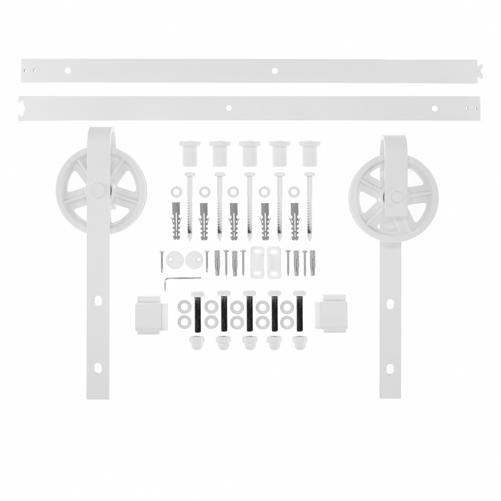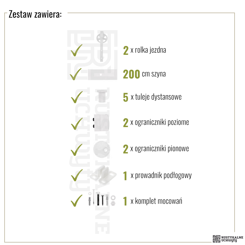Oferowane prowadnicę zawierają wszystkie niezbędne elementy potrzebne do montażu drzwi przesuwnych. Każdy zestaw prowadnicy zawiera: