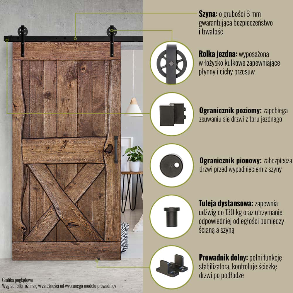 - Produkt dedykowany jest do drzwi przesuwnych, których masa całkowita nie przekracza 110 kg, ostatecznie jednak waga drzwi musi być dostosowana do rodzaju ściany i jej wytrzymałości.