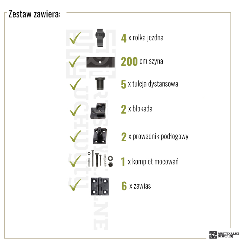 Oferowane prowadnice zawierają wszystkie niezbędne elementy potrzebne do montażu drzwi przesuwnych składanych. Każdy zestaw prowadnicy zawiera: