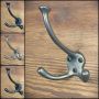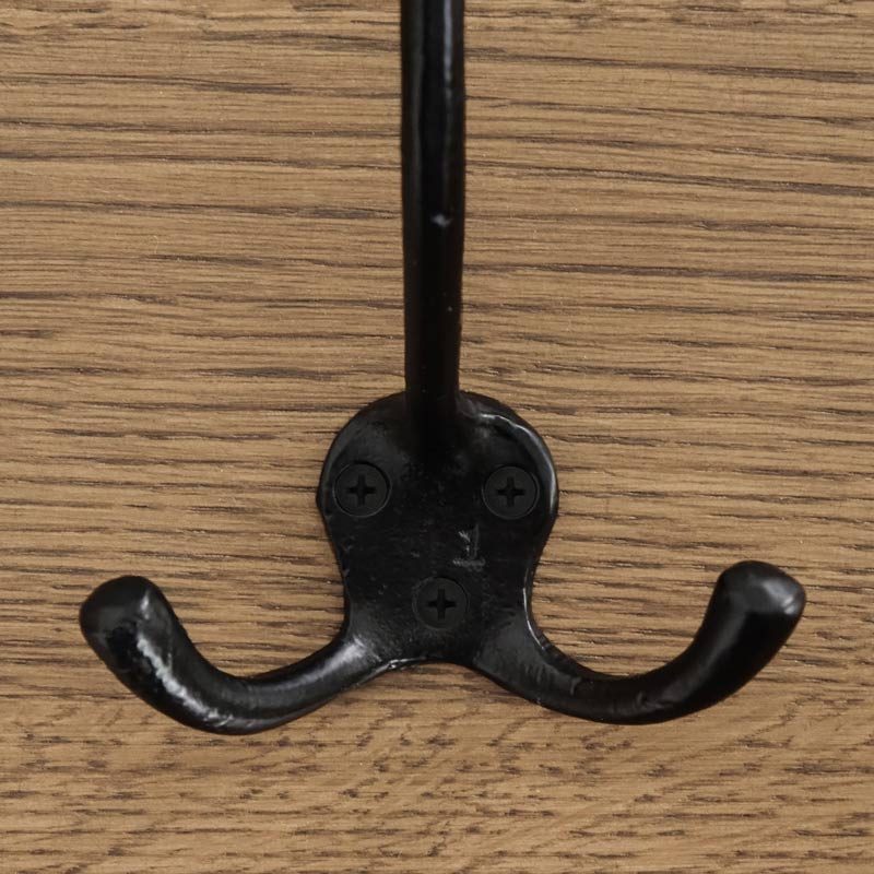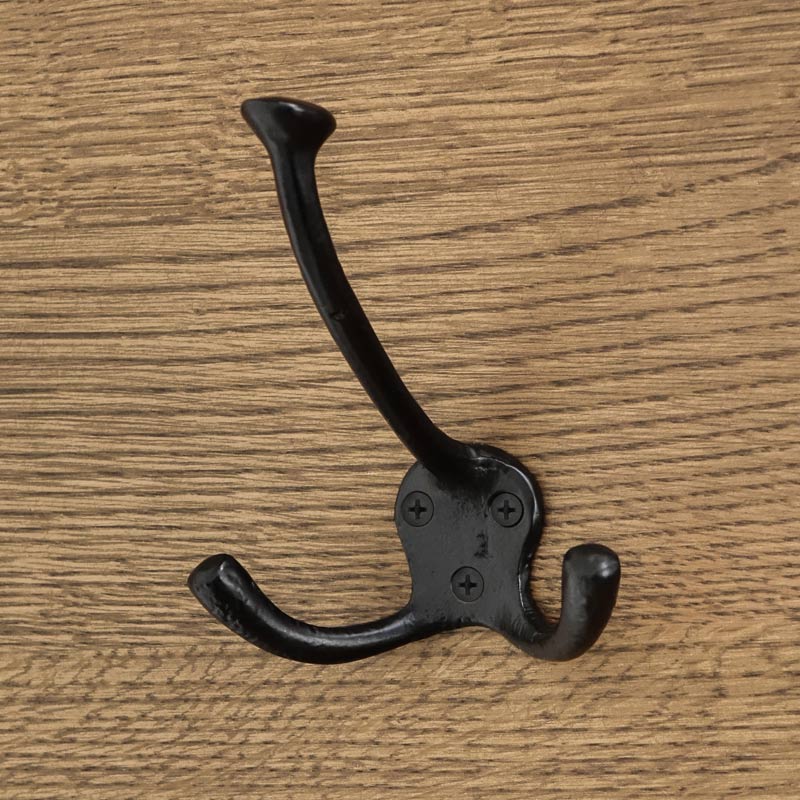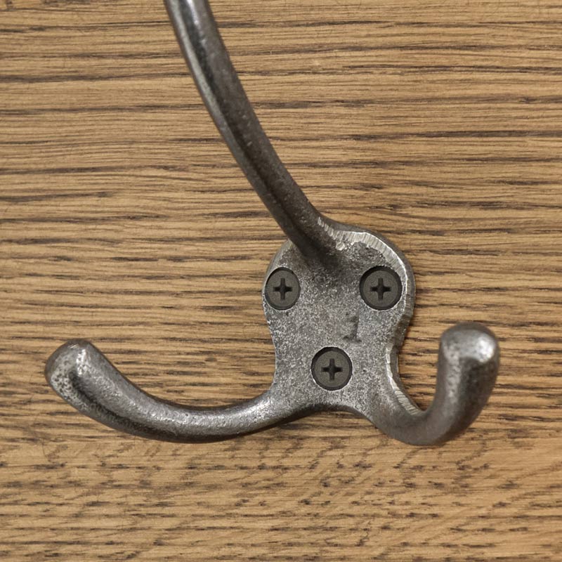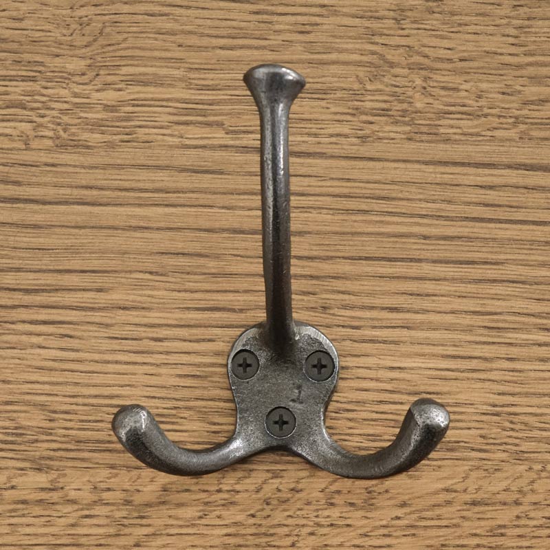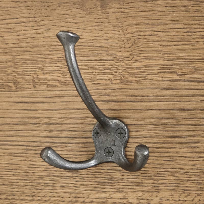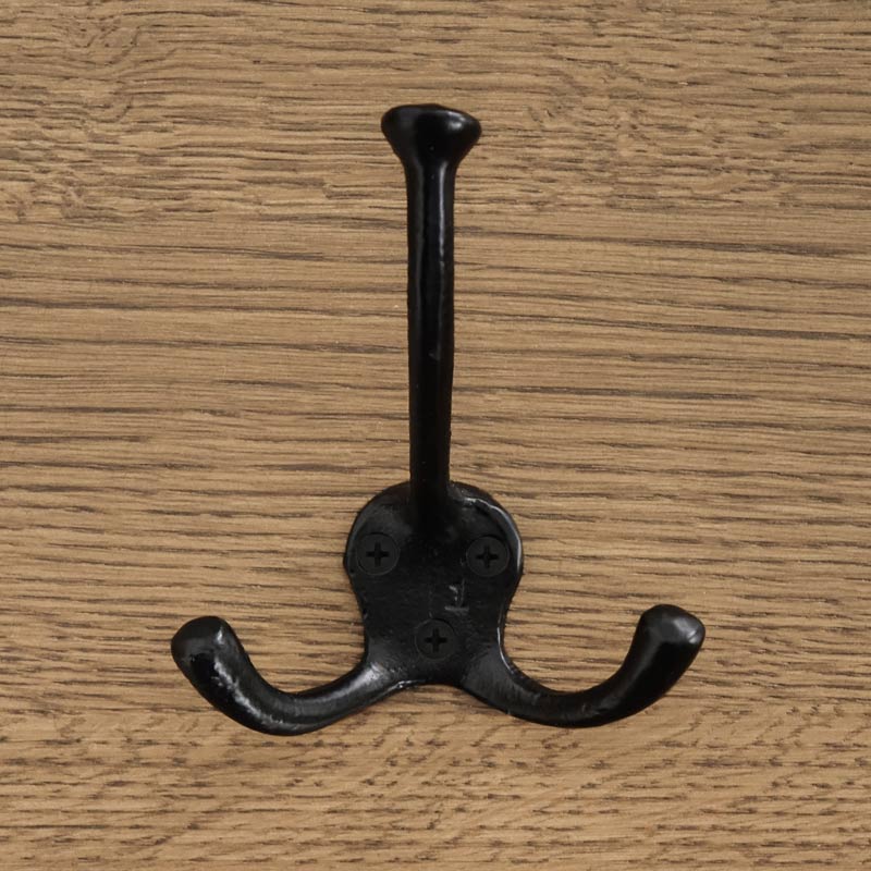 Hak wieszakowy potrójny to odlany ze stopu żeliwnego bardzo funkcjonalny dodatek do wnętrz o rustykalnym klimacie. Prosty wzór osadzony na płaskiej podstawie daje szerokie możliwości zastosowania. Dwa ramiona, podobnej długości zostały wzbogacone o trzecią zawieszkę, która góruje nad całością.