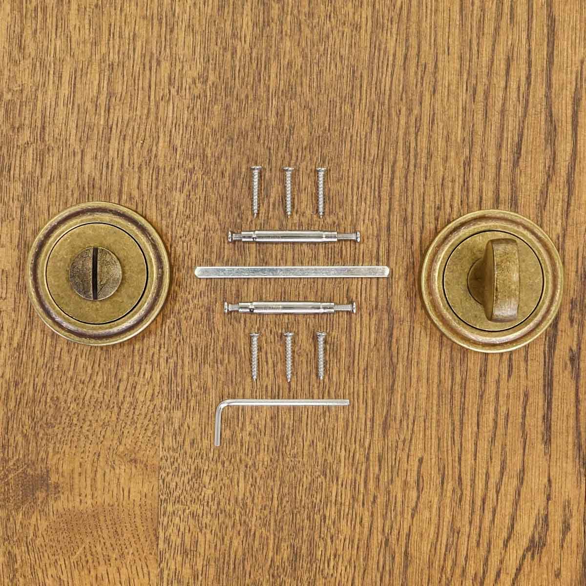 zestaw zawiera dwie klamki (do 1 skrzydła drzwiowego), trzpień, elementy montażowe